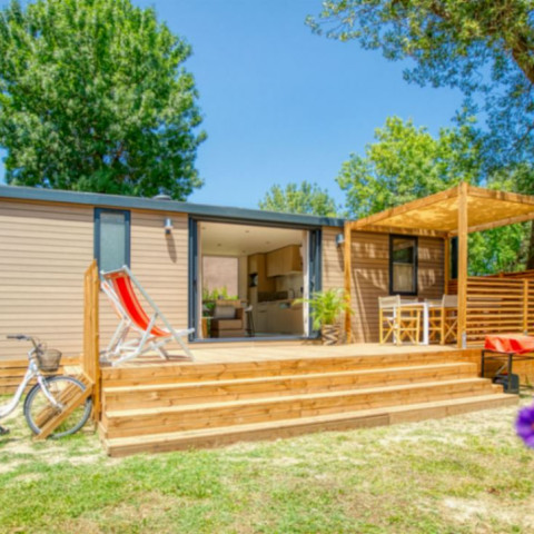 Kommen Sie in ein Mobilheim Luxe für 4 oder 6 Personen oder in die neue Luxe Suite für 8 Personen in einer baumbestandenen Umgebung in Argelès-Sur-Mer.
