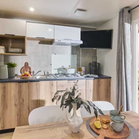 • Diseñada para alojar de 6 a 7 personas, la gama Prestige más reciente (hasta 40 m²) ofrece la comodidad de un equipamiento práctico adicional (televisión, aire acondicionado y pequeños electrodomésticos). Los Sunêlia Grand Prestige Premium están equipados con lavavajillas.