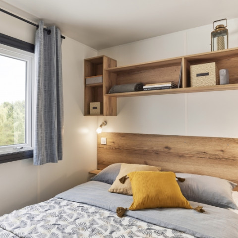 • En la gama Confort, disfrute de mobil-homes de 25 a 32 m² de superficie. Con 2 a 3 dormitorios, pueden alojar de 2 a 7 veraneantes. Amueblados y equipados, ofrecen un confortable espacio vital, así como una terraza cubierta.
