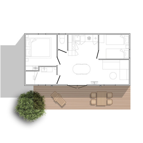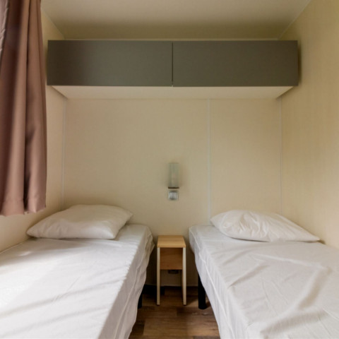 - Dans la gamme Confort, profitez des mobil-homes offrant 25 à 32m² de surface. Abritant 2 à 3 chambres, ils peuvent accueillir 4 à 6 vacanciers. Meublés et équipés, ils vous proposent un espace de vie confortable ainsi que leur terrasse couverte !