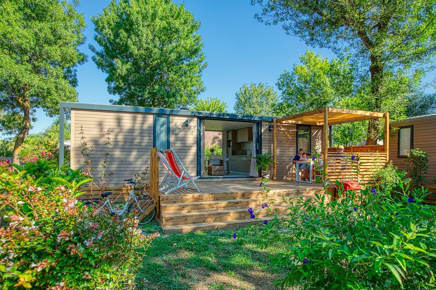 Voetgangersgebied met bomen - Stacaravan met twee grote ramen door het hele huis